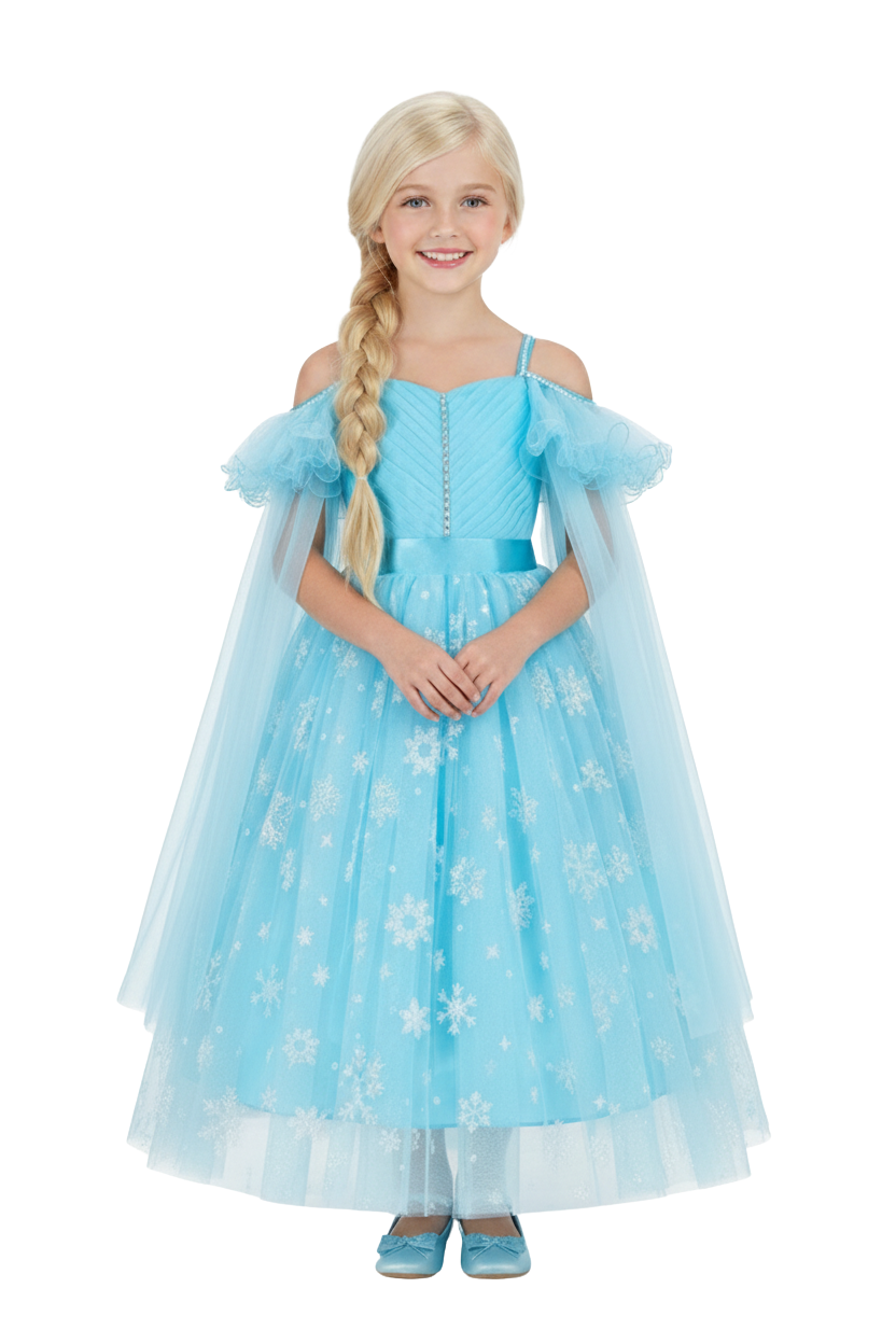 Malzeme: %100 polyester, ışıltılı tül ve saten kumaş kombinasyonu Kullanım alanı: Doğum günü partileri, kostüm etkinlikleri, özel günler Kullanım talimatı: Elde yıkama önerilir. Ütülenmez. Güvenlik uyarısı: Ateşten uzak tutunuz. 3 yaş altı çocuklar için uygun değildir. Menşei: Türkiye
