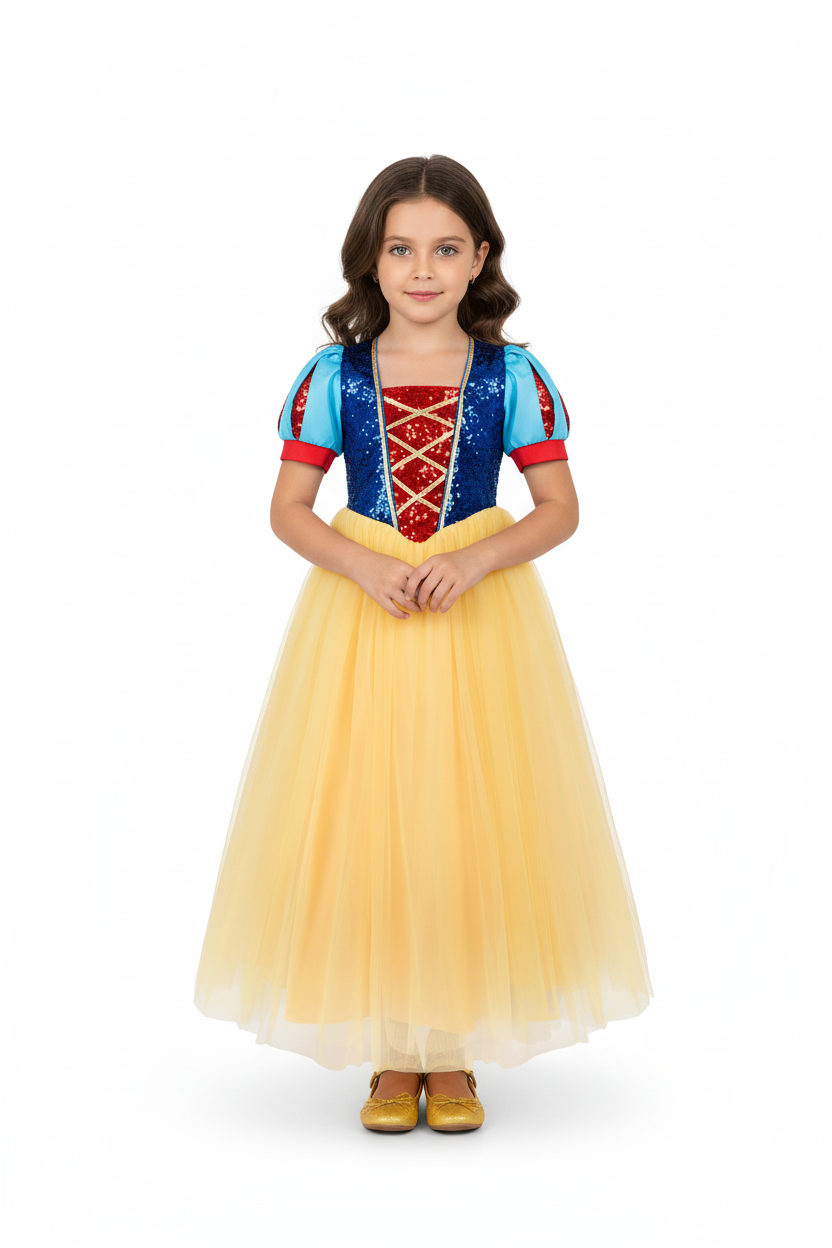 Parlak mavi payetli üst kısmı, kırmızı detaylı kolları ve altın rengi tül eteğiyle göz kamaştırıcı bir görünüm sunar.